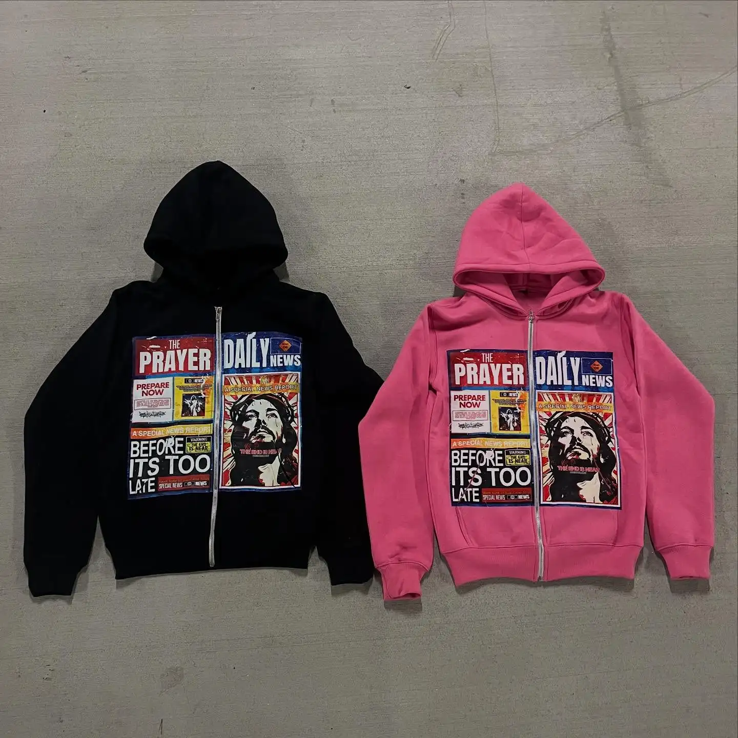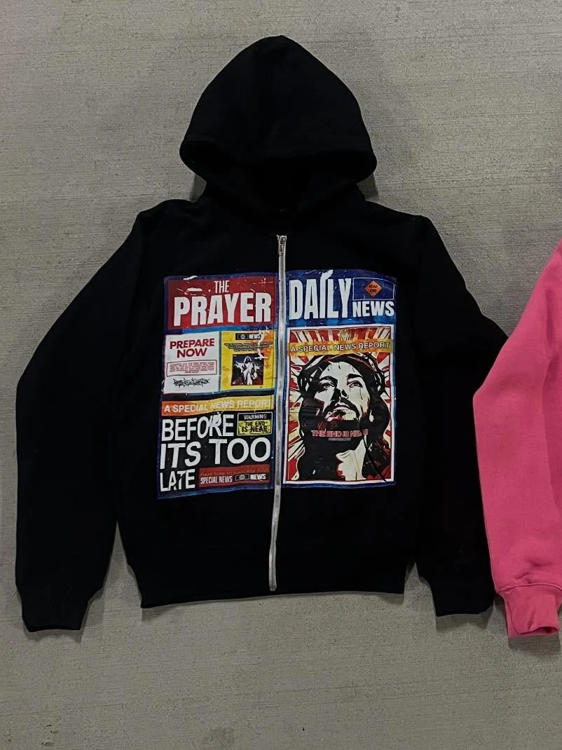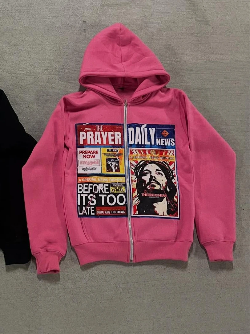 High Street American Retro Newspaper Printed Jackets New Zipper Hoodie Men Gothic Fashion Loose Top Unisex Clothing